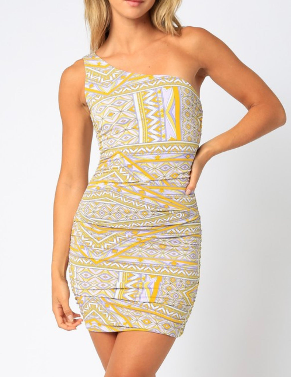 Get ready to turn heads with our One Shoulder Dress! This mini dress features a bodycon style, flattering ruched side detail, and is made with a comfortable polyester-spandex blend. Complete your party look with this trendy and elegant piece.