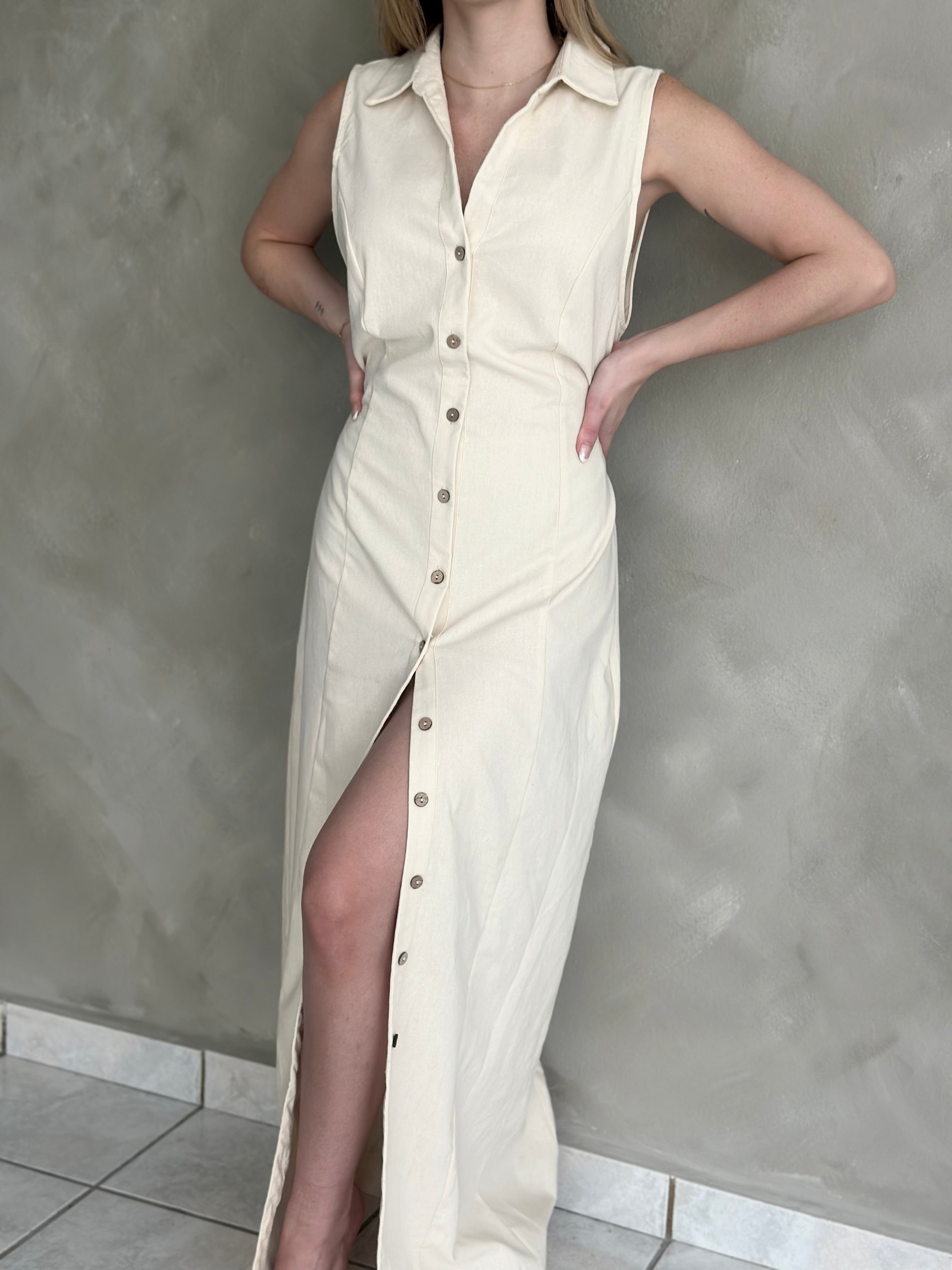 Wrap yourself in subtle elegance with our Beige Button Up Dress. Perfect for any occasion, this dress features a sophisticated button-up design, long flowing silhouette, and sleeveless style. Make a statement and turn heads with this must-have addition to your wardrobe.